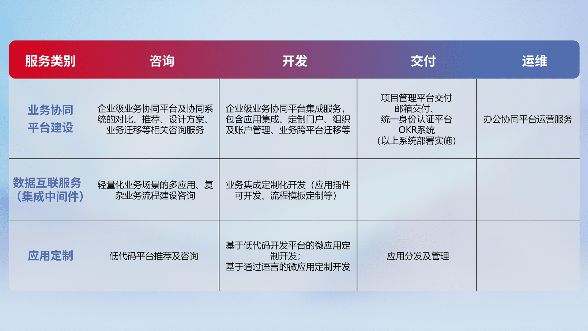 针对钉钉、、、、企微、、、、IDaas等平台级产品提供产品的规划、、方案、、、、交付、、、、定制化开发等服务,,实现如统一协同办公、、、智能客户服务、、混合会议管理、、智能数据查询、、、、等业务场景,,实现数字化转型。。。