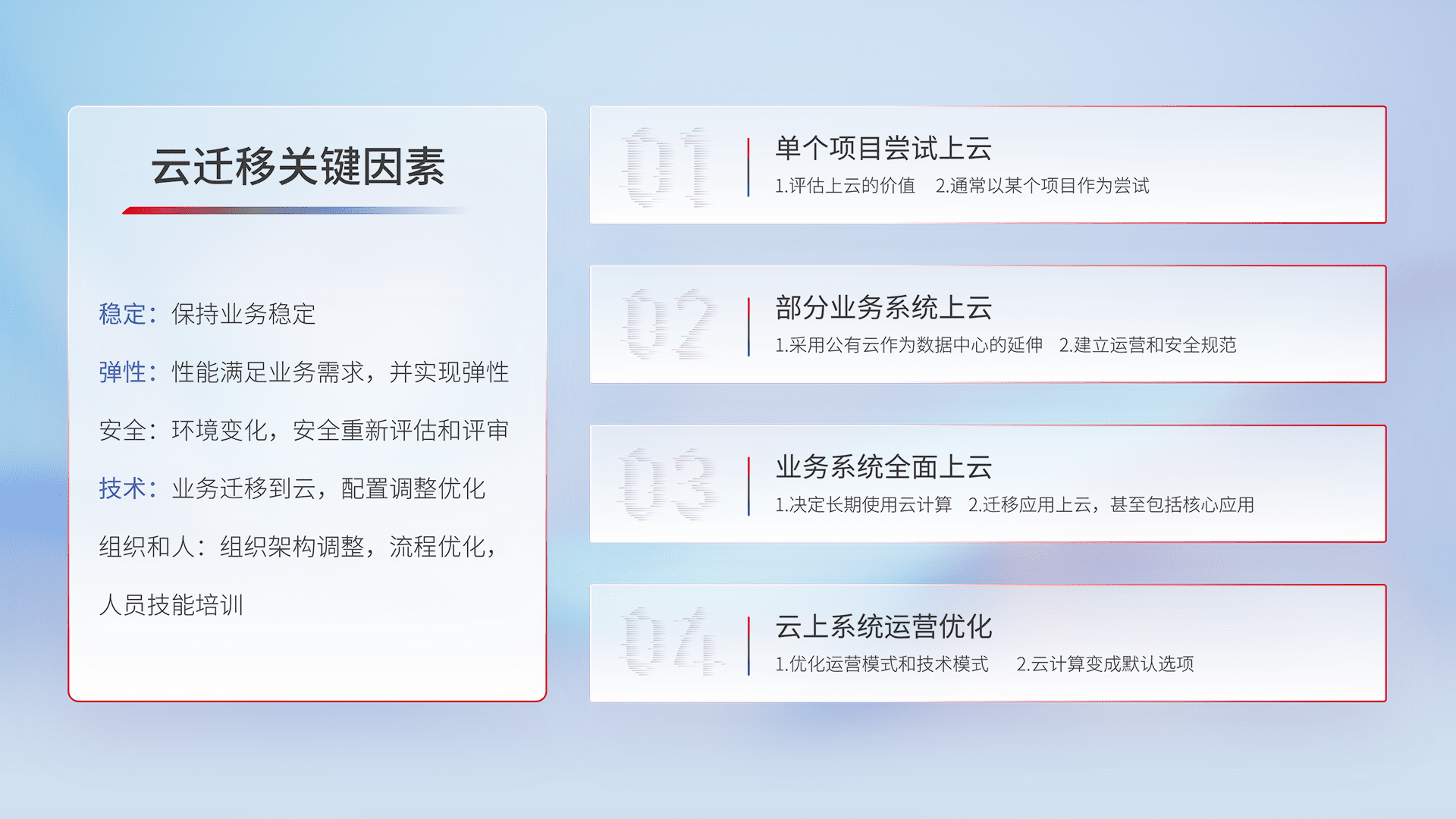 结合实际业务,,,从规划设计、、、云平台选型、、、云原生改造、、、、数据迁移、、集成交付,,,迁移全过程为客户识别最佳上云路径,,,,做好风险识别管理,,,设计网络架构、、身份权限、、、安全审计合规、、、操作审计、、、、日志审计、、、、监控告警策略、、、、多站点容灾设计等,,对云上基础设施进行整体规划,,提升IT治理水平,,,,以满足弹性、、、、高可用、、、、高性能的需求。。