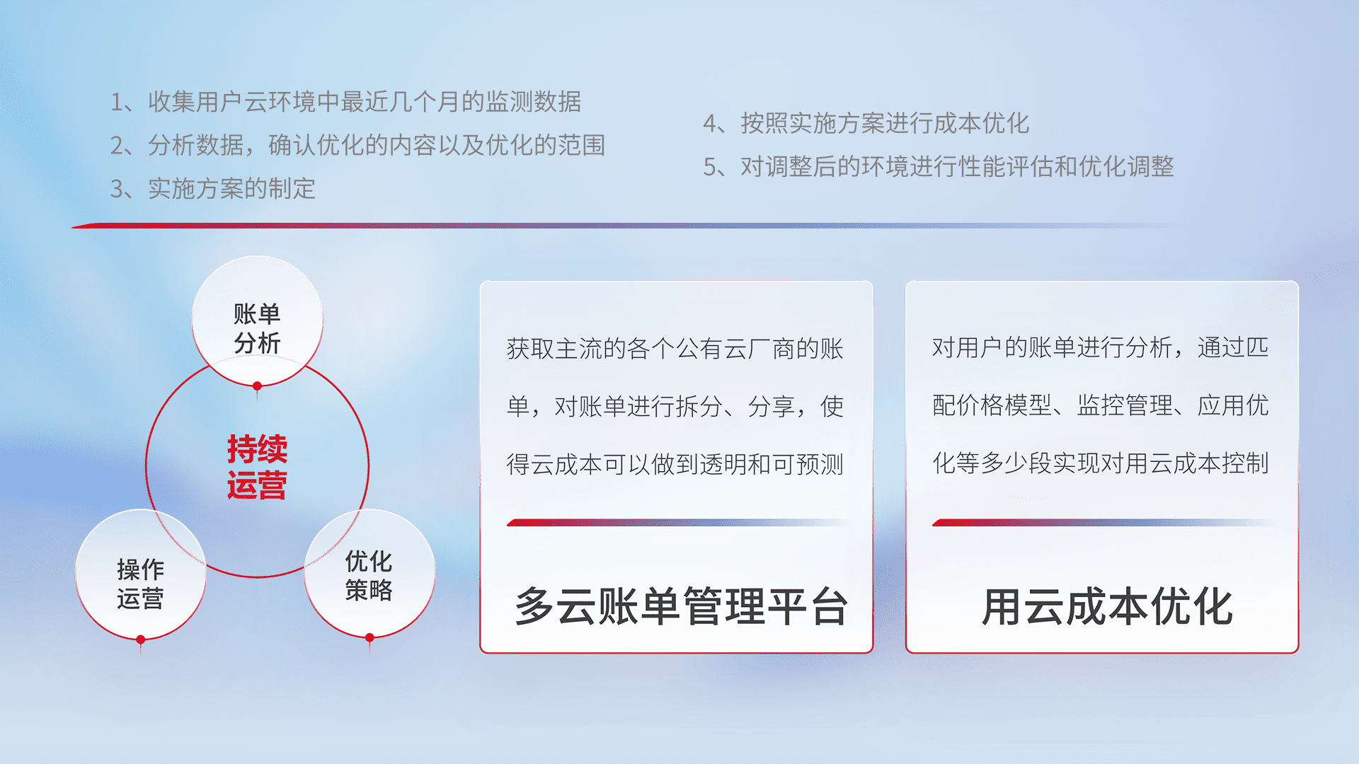 通过多云纳管,,,,以统一的资源数据模型把客户的云资源进行抽象和封装,,进而实现对多云资源的统一操作,,,,保障云资源管理的可靠性、、、稳定性与可用性。。。。量身定制化运维内容,,,配置、、、开发运维、、补丁管理、、、备份、、、、监控、、、认证和访问管理、、审计和日常巡检等,,,,保障在用云过程中的可靠度,,稳定度以及高可用率。。。。